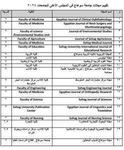 وأوضح الدكتور عبدالله إسماعيل مدير مركز النشر العلمي بالجامعة انه طبقًا للتصنيف حصلت المجلات العلمية التي تصدر عن كلية الطب البشري علي ٧ نقاط وهي Egyptian Journal of Neck Surgery and Otorhinolaryngology ومجلة Egyptian Journal of Clinical Ophthalmology ومجله Egyptian Journal of Orthopedic Research ومجلة Sohag Medical Journal.