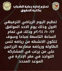 تعتزم إدارة رعايه الشباب بكليه الحقوق تنظيم اليوم الرياضي الترفيهي الاول وذلك يوم الاحد الموافق ١٣/ ١٠/ ٢٠٢٤م