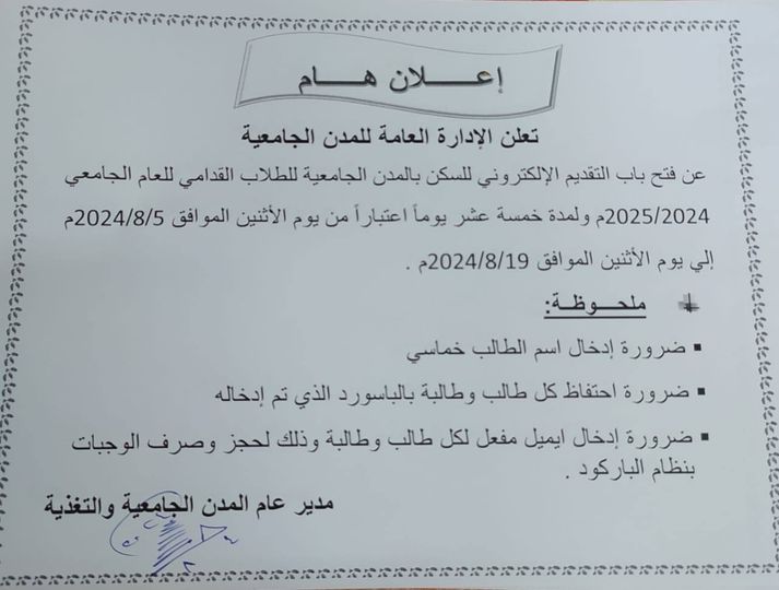كما تنوه الإدارة العامة للمدن الجامعية إلي ضرورة ادخال اسم الطالب خماسي، ضرورة احتفاظ كل طالب وطالبة بالباسورد، ضرورة ادخال ايميل مفعل لكل طالب وطالبة لحجز وصرف الوجبات بنظام الباركود.