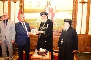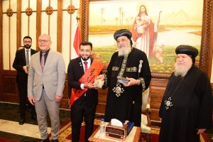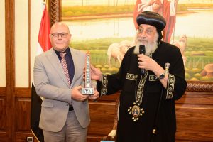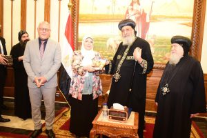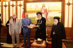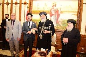 تواضروس الثاني الدكتور حسان النعماني مجسم “مسله “منحوت عليها اسم مصر بكل اللغات التي تعبر عن عراقه وعظمه الحضارة الفرعونية، وايضاً كتاب بعنوان ابرز ١٠٠ شخصية قبطية علي ارض مصر، الي جانب توزيع عدد من الكتب والهدايا علي الوفد الطلابي، كما تبادل رئيس الجامعة وقداسة البابا الدروع التذكارية.