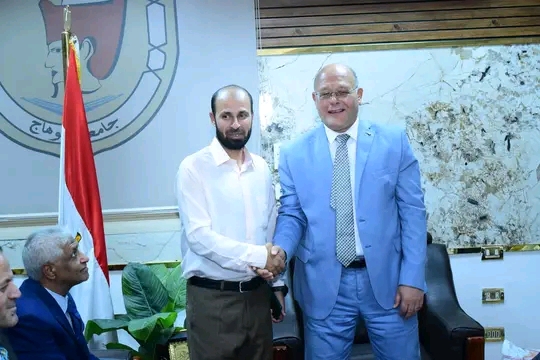 التقي الدكتور حسان النعماني رئيس جامعة سوهاج بخمسة باحثين وافدين من المملكة العربية السعودية ومن المملكة الأردنيه الهاشمية، والذين تم منحهم درجة الدكتوراه، في تخصص التدريب الرياضي وعلوم الحركة، بكلية علوم الرياضة بالجامعة، بحضور كلاً من الدكتور مؤمن عبد العزيز عميد الكلية، الدكتور احمد عبد الله عميد الكلية السابق، الدكتور ممدوح السيد والدكتور محمد كمال وكلاء الكلية وعدد من أعضاء هيئة التدريس بالكلية، وذلك بمكتب رئيس الجامعة بالمقر القديم للجامعة.